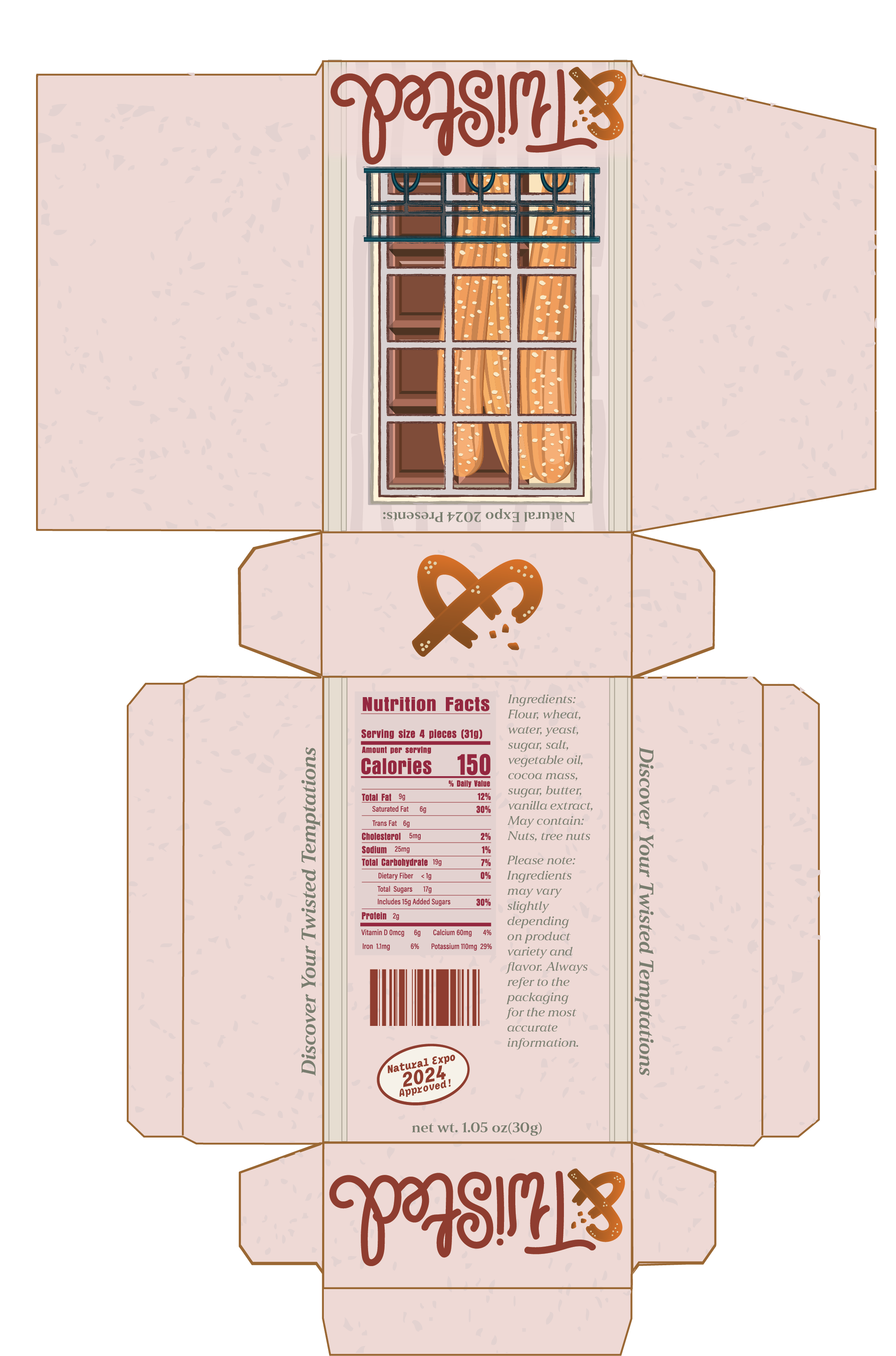 The company, &Twisted, wants to bring its fun, decorative treat gift boxes to the Natural Expo 2024. The brand specializes in creating unique and indulgent treats consisting of different flavored pretzels and chocolates, that are naturally crafted. Each participant of the Natural Expo 2024 will receive a box of &Twisted treats, which are intended to be eaten throughout the event. They wanted &Twisted to redesign their packaging to a cleaner design that blends well with the rest of the expo. There are elements to the newly designed package that are a must: expo name, business name, graphics, colors, type style, type size, nutrition facts, ingredients, and a bar code. The goal for &Twisted is to show that a gift box can be both; a tasty treat that comes with a complementary card. Instead of the consumer having to buy both separately, less money is spent, and the design will be a memorable experience for the consumer.