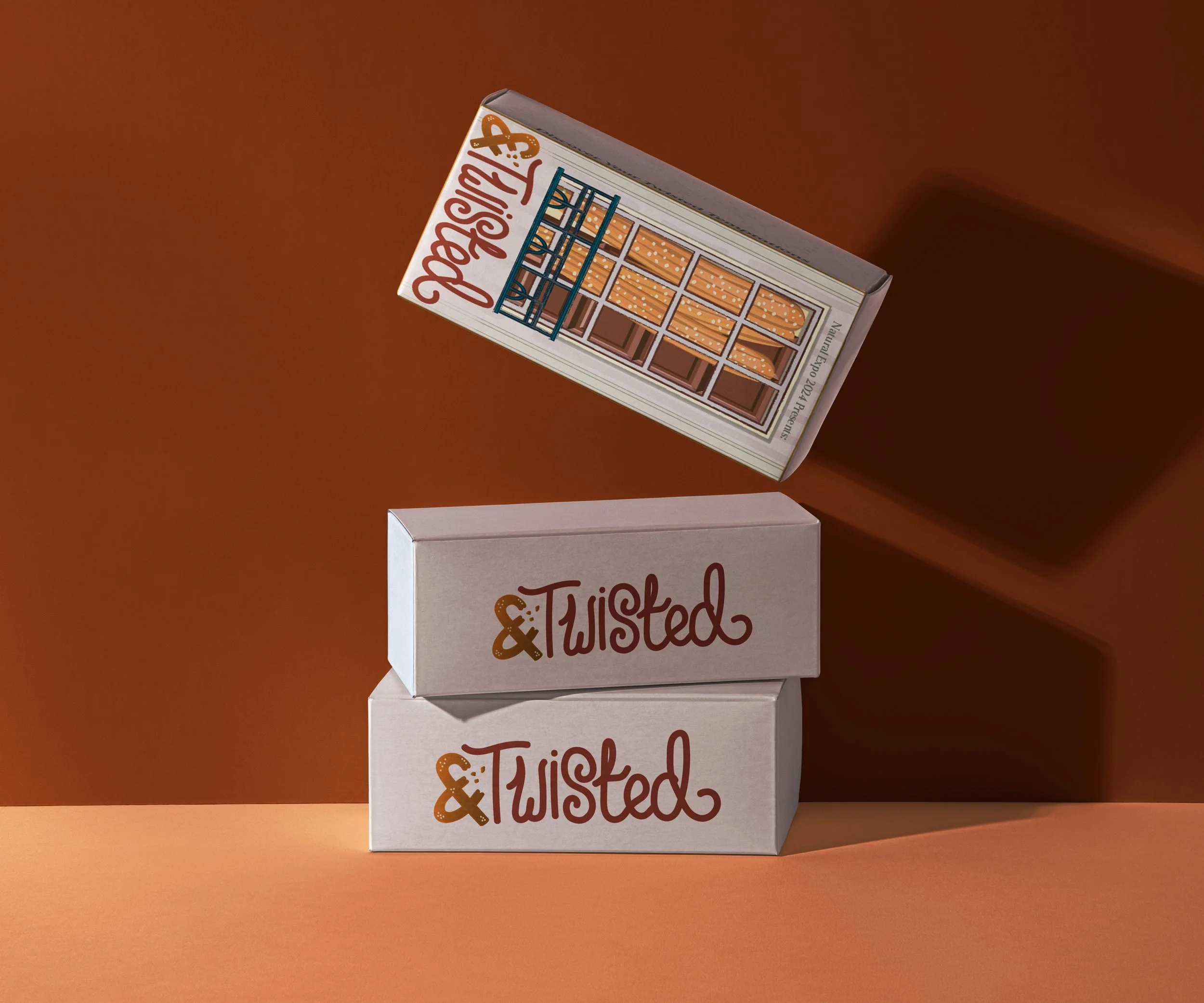 The final packaging design for &Twisted is presented on fiber-based packaged boxes, reminding us that a treat can be tasty and easy on the environment. With all natural ingredients and natural packaging, &twisted is officially ready for the 2024 Natural Expo.